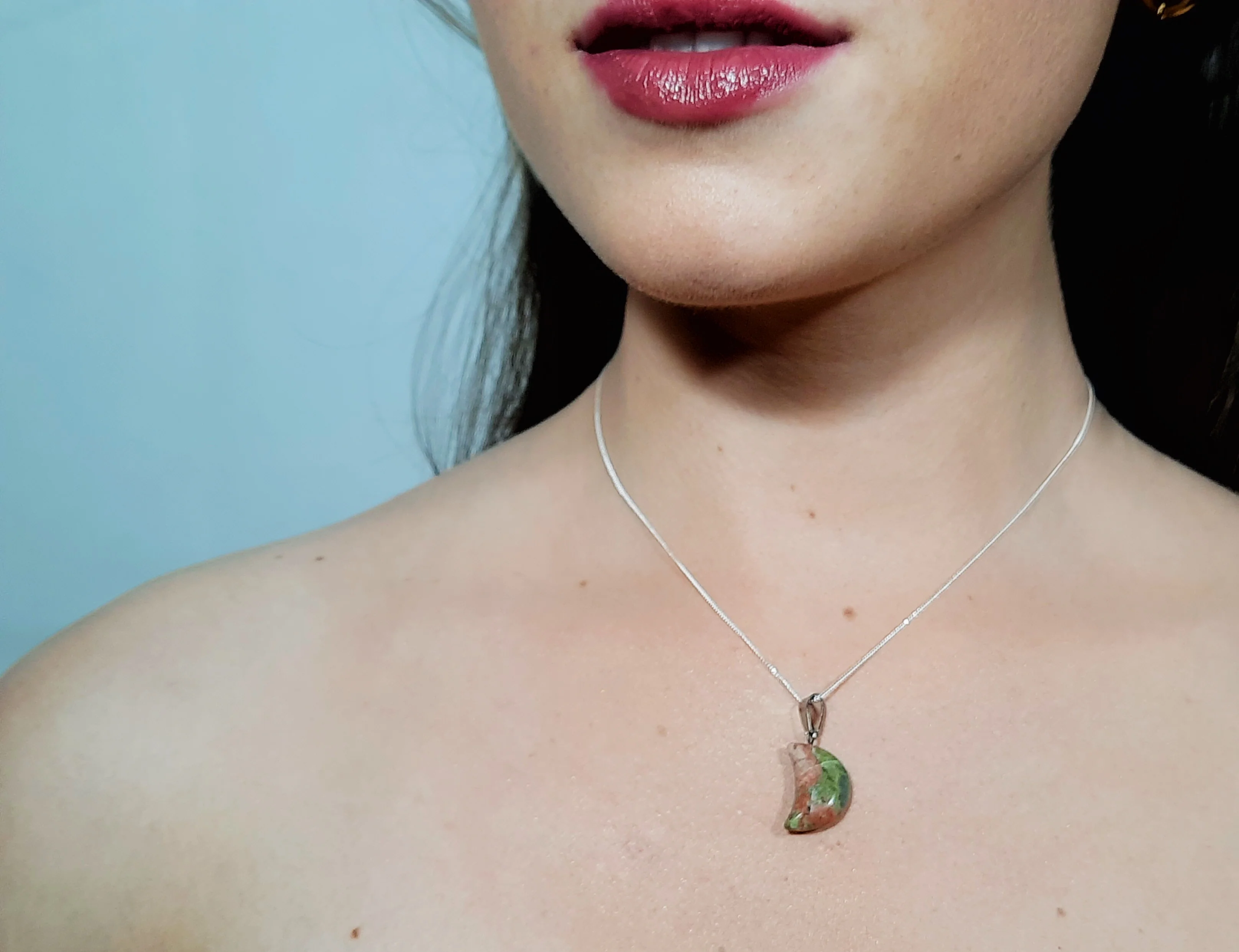Crystal Unakite Crescent Moon Necklace Talisman of Sight, Dreaming, Healing & Harmony